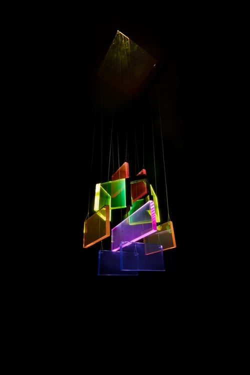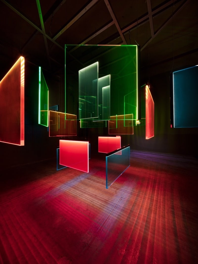 Mandala 1200 consists of separate, thick, clear colored acrylic panels, each one illuminated by a side, top or bottom edge steel profile containing warm LED lights. The panels conduct light through them, emphasizing the color aspect as well as defining very clearly the outlines of each panel. When the symmetrical composition is installed, an almost Tron-like line definition of overlapping geometries appears. The panels are suspended from a top plate by thin steel cables which also bring the electricity.